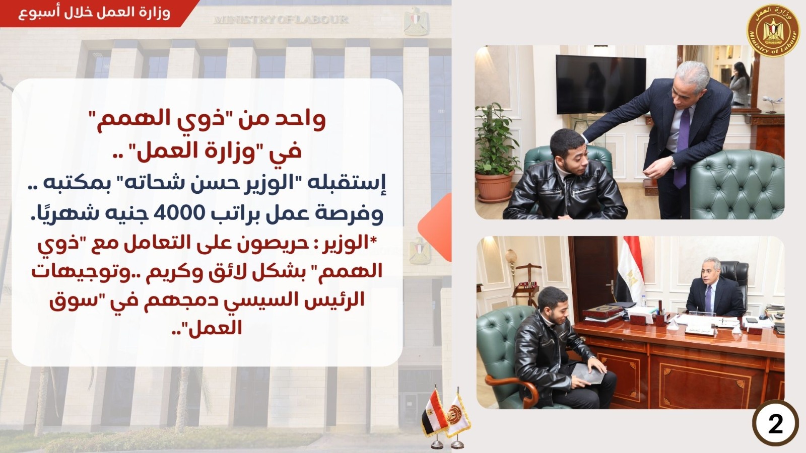 واستقبل حسن شحاتة وزير العمل، بمكتبه بديوان عام "الوزارة"، المواطن أحمد عمر جاد الكريم، من ذوي الإحتياجات الخاصة "إعاقة بصرية"، برفقته والده، وسَلّمهُ عقد عمل بشركة سيتي ستارز للإدارة والاستشارات العقارية براتب 4000 جنيه شهريًا..