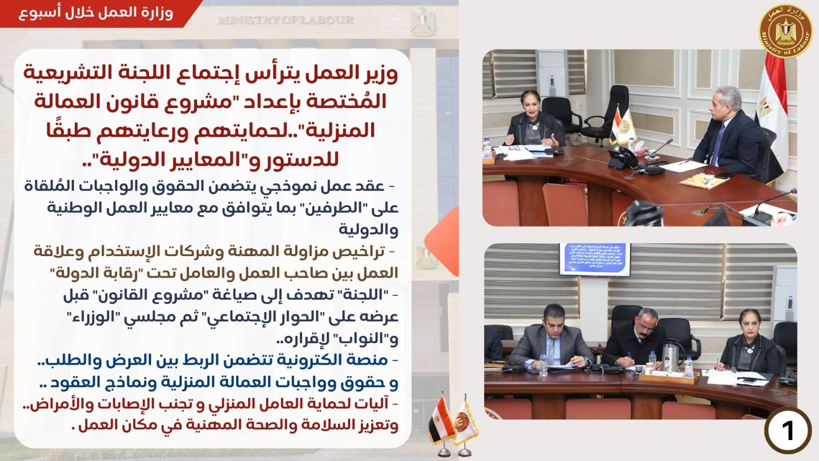 ترأس حسن شحاتة وزير العمل، بديوان عام "الوزارة"، اجتماعًا للجنة التشريعية المُختصة بإعداد "مشروع قانون العمالة المنزلية"، ومن في حُكمهم، بحضور مُمثلين عن وزارات العدل، والتضامن الاجتماعي، والتخطيط والتنمية الاقتصادية، والتعاون الدولي، والمجالس "القومي لحقوق الإنسان، والقومي للمرأة، والقومي للطفولة والأمومة"، واللجنة التنسيقية لمكافحة ومنع الهجرة غير الشرعية والإتجار في البشر، والمستشار القانوني لوزير العمل "مُقررًا للجنة"، حيث تختص "اللجنة" بإعداد ودراسة مشروع قانون العمالة المنزلية ومن في حُكمهم،بما يتوافق مع الدستور المصري،ومعايير العمل الوطنية والدولية، وحقوق الإنسان..