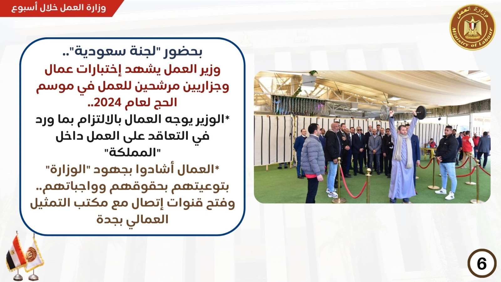 وشهد حسن شحاتة وزير العمل، اختبارات عمال وجزارين من المرشحين للعمل خلال موسم الحج للعام الهجري 1445، والميلادي 2024، وذلك بقاعة جرين بلازا بمنطقة المريوطية بمحافظة الجيزة، والتي تنظمها " لجنة سعودية"، تتكون من: إبراهيم المسيع، والنقيب إبراهيم الصالح ممثلي وزارة الداخلية السعودية، وأحمد اليحيى ممثل وزارة المالية السعودية، ويعقوب اللهيبي ممثل وزارة الموارد البشرية والتنمية الاجتماعية السعودية، وسراج فلالي، ومحمد الروابدة وماجد العتيبي، وهتان بغدادي، وعقيل الزبيدي، وعبد الرحمن الزهراني، ومصطفى التركي، وخالد الطويرقي، وسعيد هوساوي عبد الرحمن الشريف، وعبد الرحمن الطاسان من ممثلي الهيئة الملكية لمكة المكرمة، وأحمد العيسى، وعبد الله الجبر ممثلي وزارة الخارجية السعودية،وذلك بحضور ممثلين عن شركات إلحاق عمالة مرخصة من وزارة العمل..