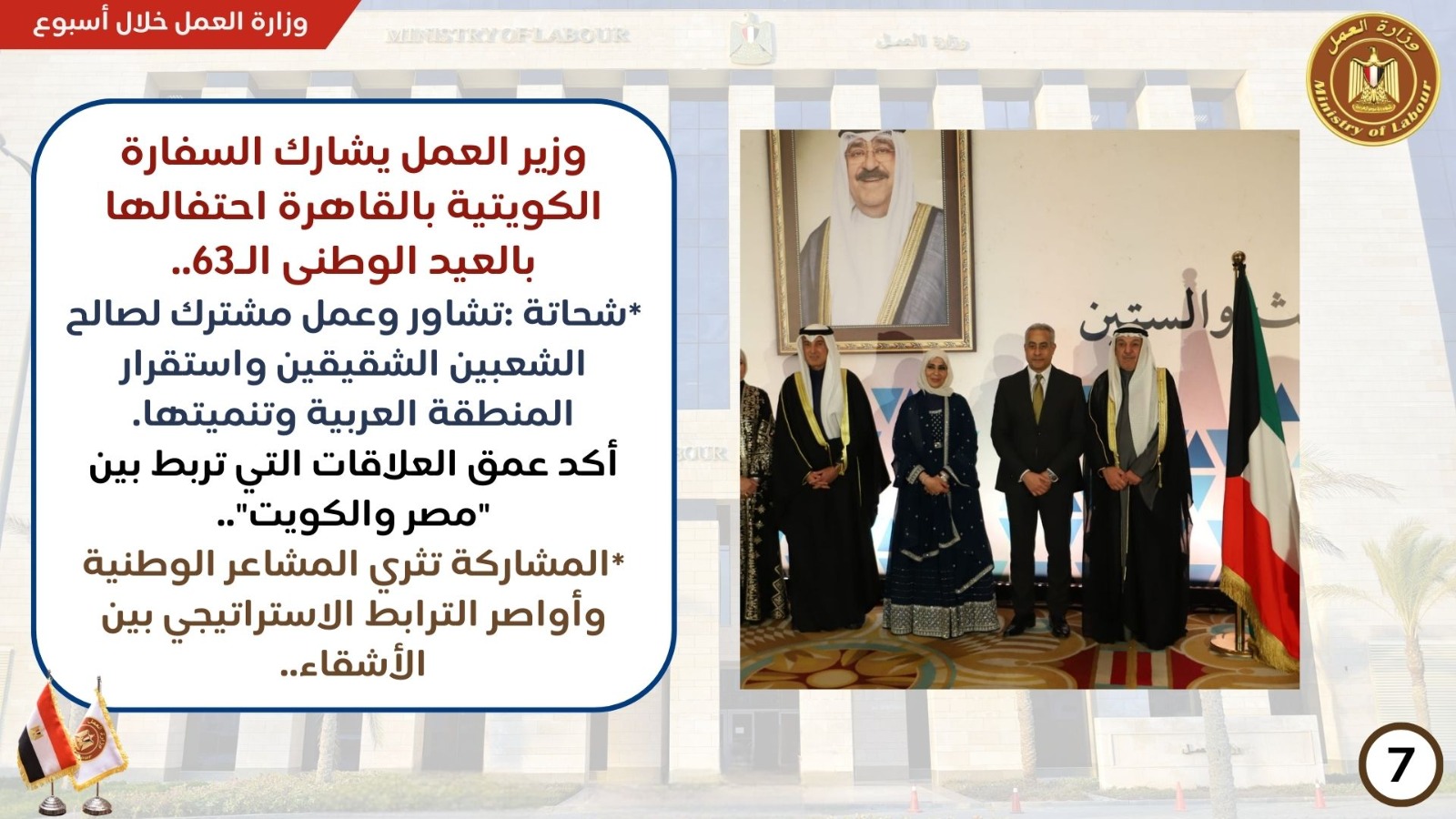 وشارك حسن شحاتة وزير العمل، السفارة الكويتية بالقاهرة،ومندوبية الكويت الدائمة لدى جامعة الدول العربية، حفل استقبال بمناسبة العيد الوطني للكويت الثالث والستين، وعيد التحرير الثالث والثلاثين، والذي نظمته السفارة الكويتية، بأحد الفنادق الشهيرة في القاهرة، بحضور عدد من سفراء الدول المعتمدين في مصر، فضلًا عن وزراء، وشخصيات إعلامية وسياسية وفنية وعامة مصرية، وكان في استقبال الوزير شحاتة، لدى وصوله، السفير غانم صقر الغانم سفير دولة الكويت بالقاهرة،والسفير طلال المطيري مندوب الكويت الدائم لدى جامعة الدول العربية.