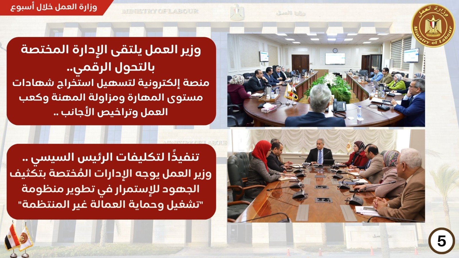 ووجه حسن شحاتة وزير العمل، في اجتماع بالعاصمة الإدارية، كافة الإدارات المُختصة بالعمالة غير المنتظمة والتحول الرقمي، بتكثيف الجهود خلال الفترة المُقبلة، للاستمرار في تطوير منظومة "تشغيل وحماية العمالة غير المنتظمة"، للتوسع في قاعدة البيانات، وتقديم المزيد من الخدمات والحماية إلى تلك الفئة، التي تعمل لدى صاحب عمل، ومُسجلة رسميًا بالوزارة، موضحًا أن توجيهات وتكليفات الرئيس عبدالفتاح السيسي، رئيس الجمهورية مُستمرة من أجل المزيد من الحماية، والتشغيل.