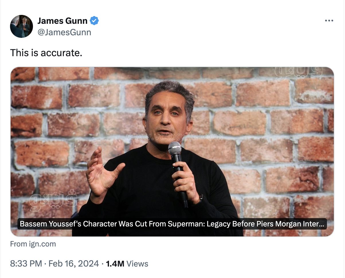 فيما أكد المخرج الأمريكي الشهير جيمس جن، حذف دور الإعلامي باسم يوسف، من فيلم،"Superman: Legacy"، بعد ظهوره مع المذيع البريطاني، بيرس مورجان، ودعمه للقضية الفلسطينية.