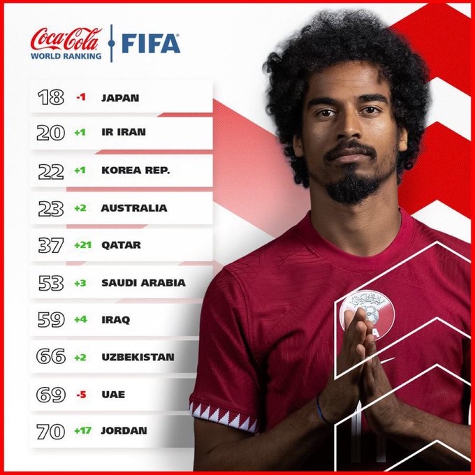 وتقدم منتخب قطر 21 مركزا في تصنيف الاتحاد الدولي لكرة القدم فيفا عن شهر فبراير بعد تتويجه بأمم آسيا قبل أيام على حساب الأردن