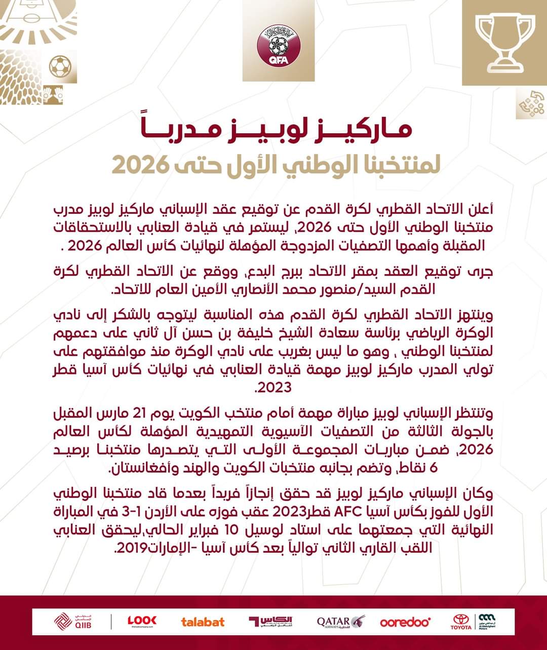 قطر ٢٠٢٣، أعلن الاتحاد القطري لكرة القدم عن توقيع عقد الإسباني ماركيز لوبيز مدرب المنتخب الأول حتى 2026، ليستمر في قيادة العنابي حتى التصفيات المزدوجة المؤهلة لنهائيات كأس العالم 2026.