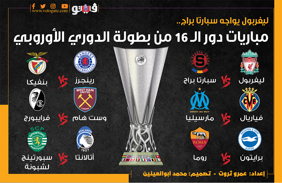 ليفربول يواجه سبارتا براج.. مباريات دور الـ 16 من بطولة الدوري الأوروبي (إنفوجراف) الجمعة 23/فبراير/2024 - 03:00 م 2/23/2024 3:00:32 PM بطولة الدوري الأوروبي، فيتو عمرو ثروت شارك طباعة 18 حجم الخط شارك طباعة ليفربول محمد صلاح قرعة الدوري الاوروبي الدورى الأوروبي اخبار محمد صلاح