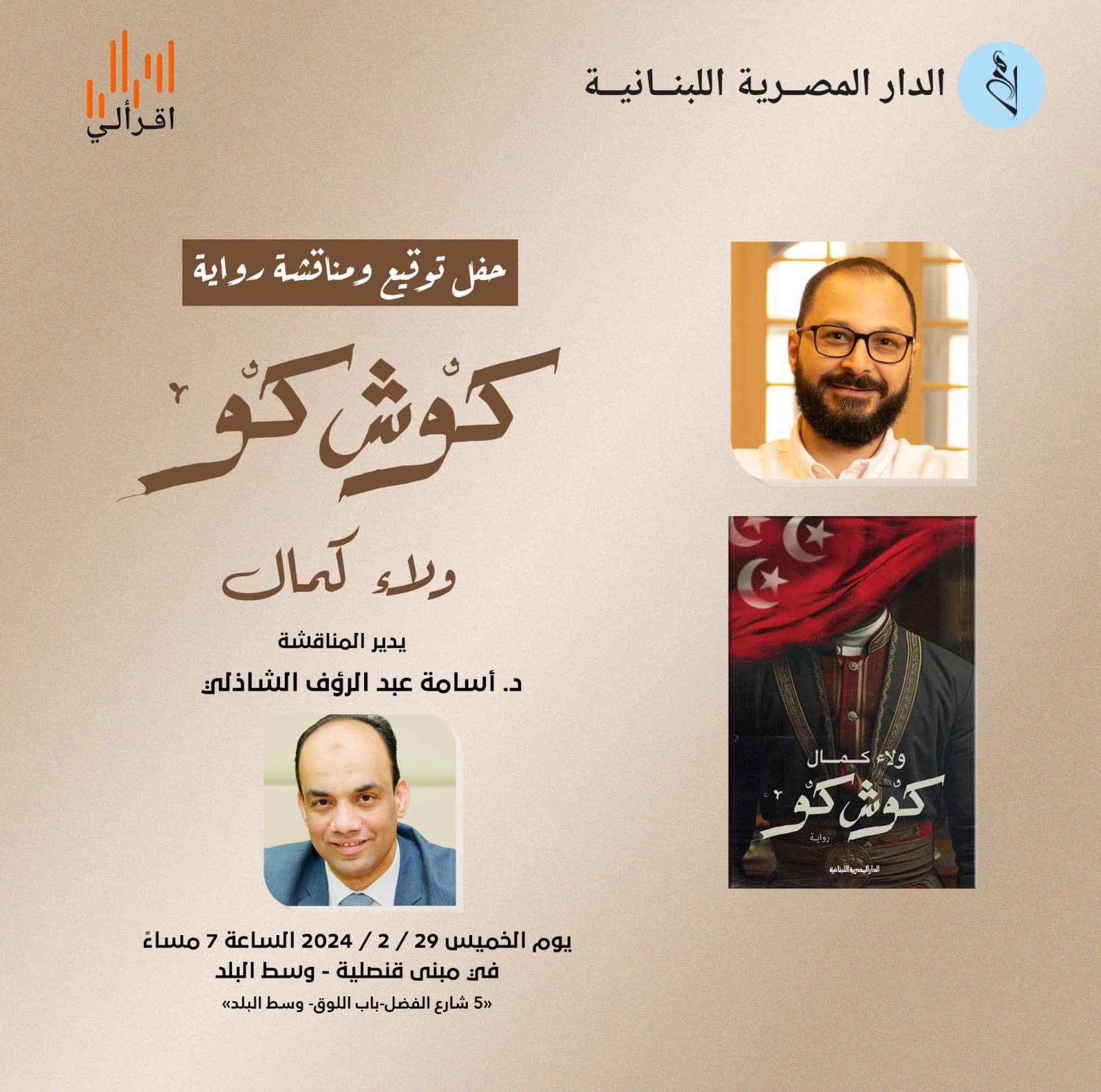 تنظم الدار المصرية اللبنانية للنشر والتوزيع، حفل توقيع ومناقشة لرواية "كوش كو" للكاتب ولاء كمال، وذلك في تمام السابعة من مساء يوم الخميس المقبل الموافق 29 فبراير الجاري، بمبنى قنصلية بوسط القاهرة، حيث يدير النقاش الدكتور أسامة عبد الرؤوف الشاذلي.