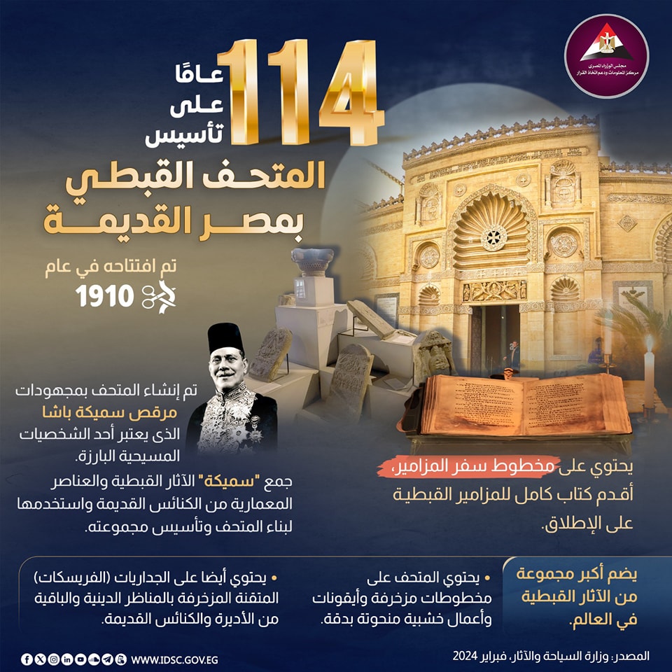 نشرت الصفحة الرسمية لمركز المعلومات ودعم اتخاذ القرار بمجلس الوزراء على موقع التواصل الاجتماعي "فيسبوك" إنفوجراف جديدا (114 عاما على تأسيس المتحف القبطي بمصر القديمة تم افتتاحه في عام 1910).