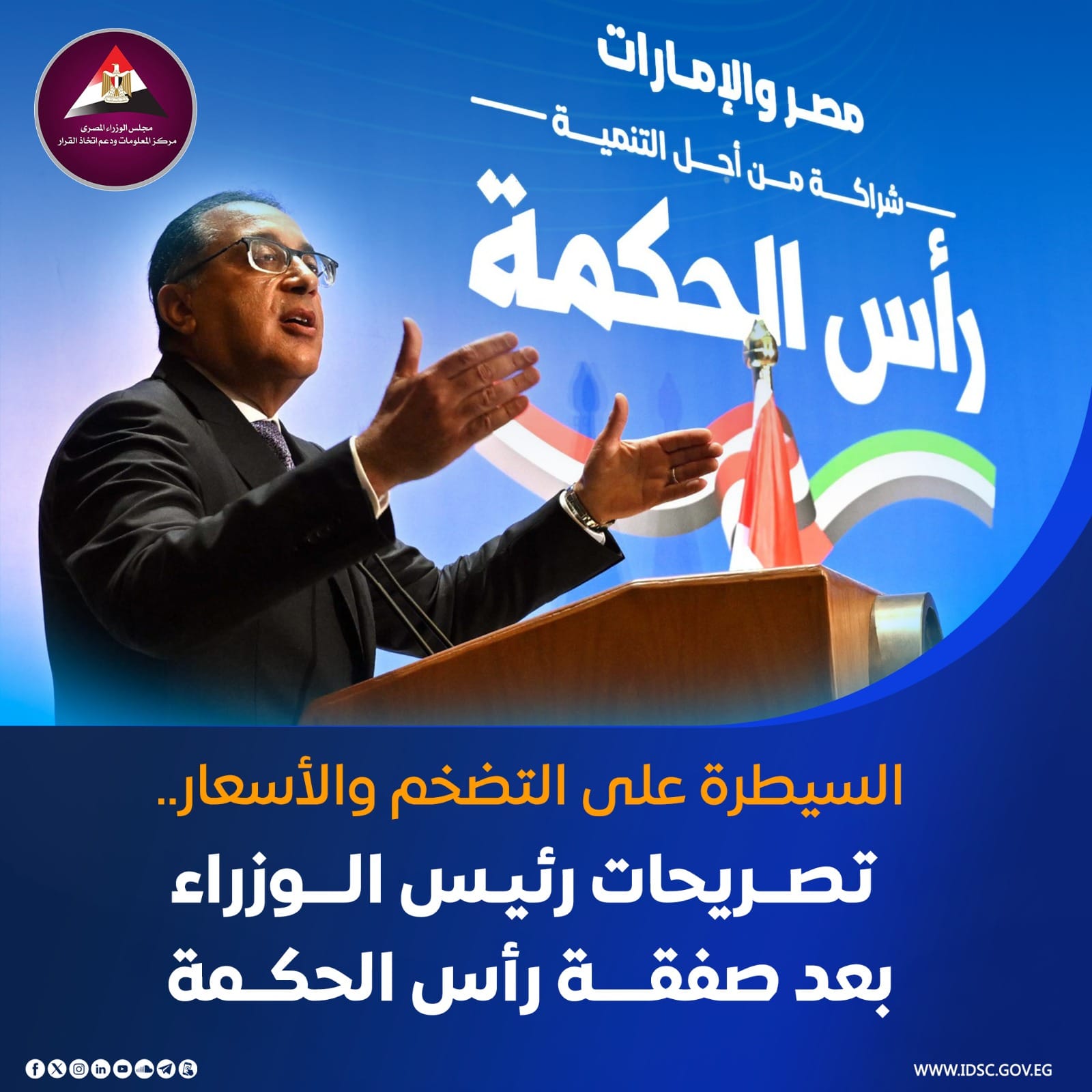 نشرت الصفحة الرسمية لمركز المعلومات ودعم اتخاذ القرار بمجلس الوزراء على موقع التواصل الاجتماعي "فيسبوك" إنفوجرافا جديدا تحت عنوان (السيطرة على التضخم والأسعار.. تصريحات رئيس الوزراء بعد صفقة رأس الحكمة).