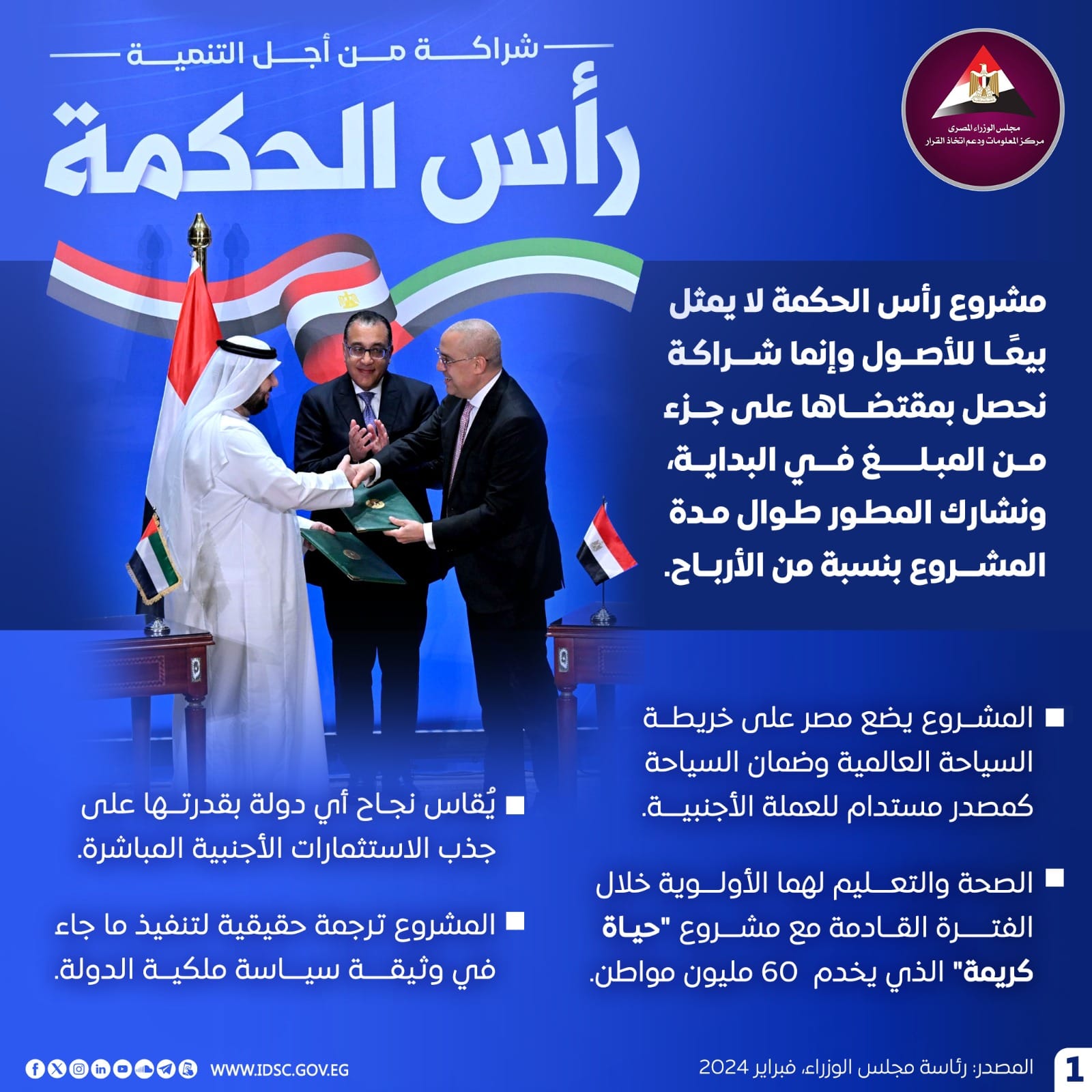 شهد الدكتور مصطفى مدبولي، رئيس مجلس الوزراء، اليوم، بالحي الحكومي بالعاصمة الإدارية الجديدة، مراسم توقيع أكبر صفقة استثمار مباشر من خلال شراكة استثمارية، بين وزارة الإسكان والمرافق والمجتمعات العمرانية، ممثلة في هيئة المجتمعات العمرانية الجديدة، و"شركة أبو ظبي التنموية القابضة" بدولة الإمارات العربية المتحدة؛ لتنفيذ مشروع تطوير وتنمية مدينة رأس الحكمة على الساحل الشمالي الغربي، والتي تأتي في ضوء الجهود الحالية للدولة المصرية لجذب الاستثمار الأجنبي المباشر.