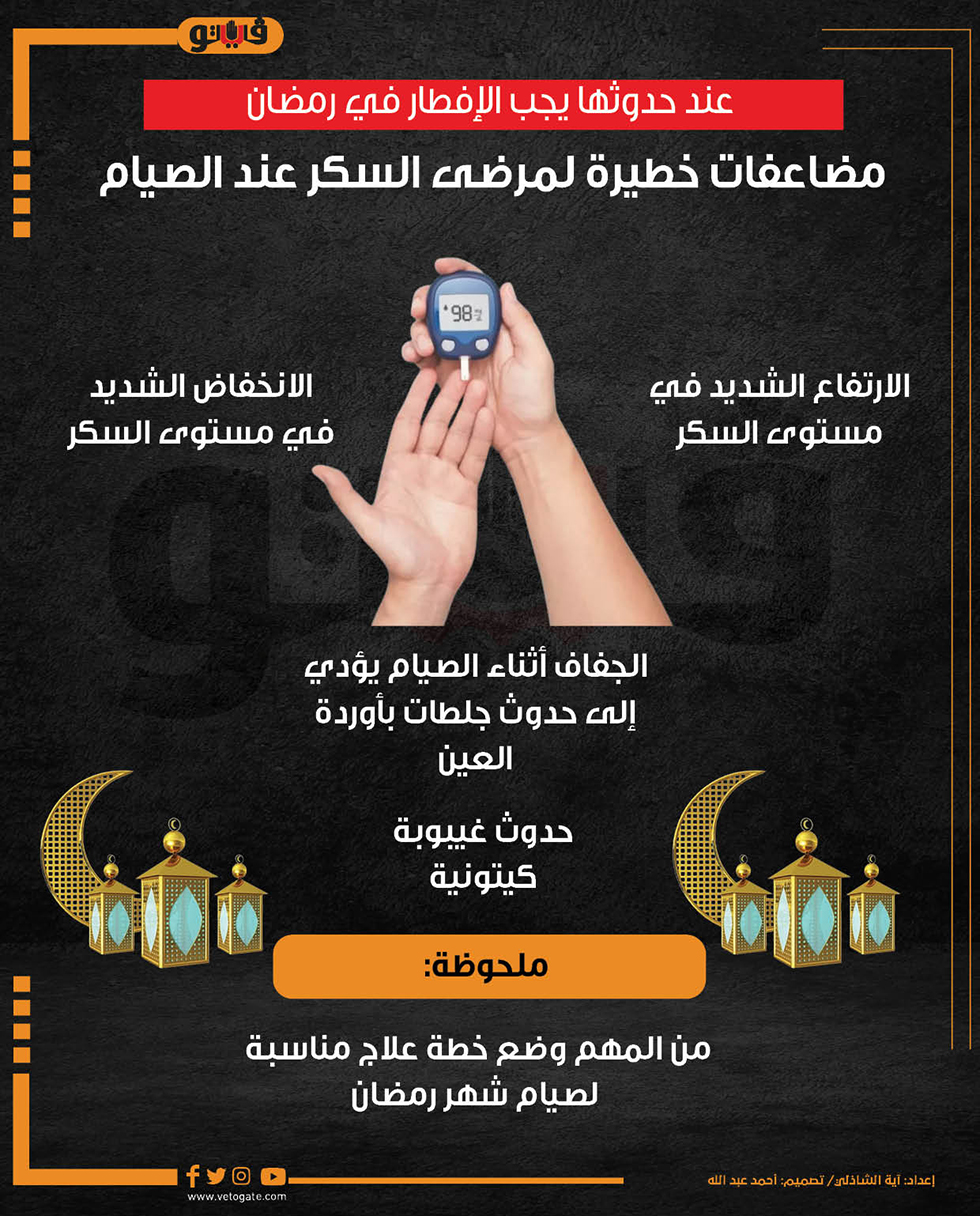 عند حدوثها يجب الإفطار في رمضان.. مضاعفات خطيرة لمرضى السكر عند الصيام (انفوجراف) الإثنين 04/مارس/2024 - 01:09 م 3/4/2024 1:09:44 PM مرض السكر، فيتو آية الشاذلي شارك طباعة 18 حجم الخط شارك طباعة السكرى مرضى السكري شهر رمضان صيام شهر رمضان مرضي السكر مرضى السكري في رمضان مستوي السكر وردة العين جلطات بأوردة العين غيبوبة كيتونية