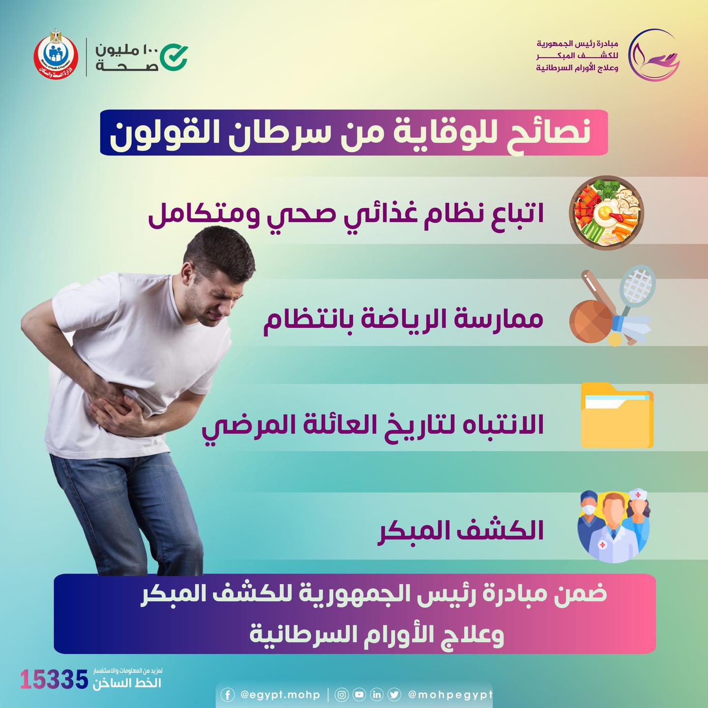 وجهت وزارة الصحة نصائح للحماية من سرطان القولون وهو من الأورام الأكبر انتشارًا بين الرجال ومن ضمن الأورام التى تم ادراج الاكتشاف المبكر لها في مبادرة الكشف عن الأورام السرطانية.