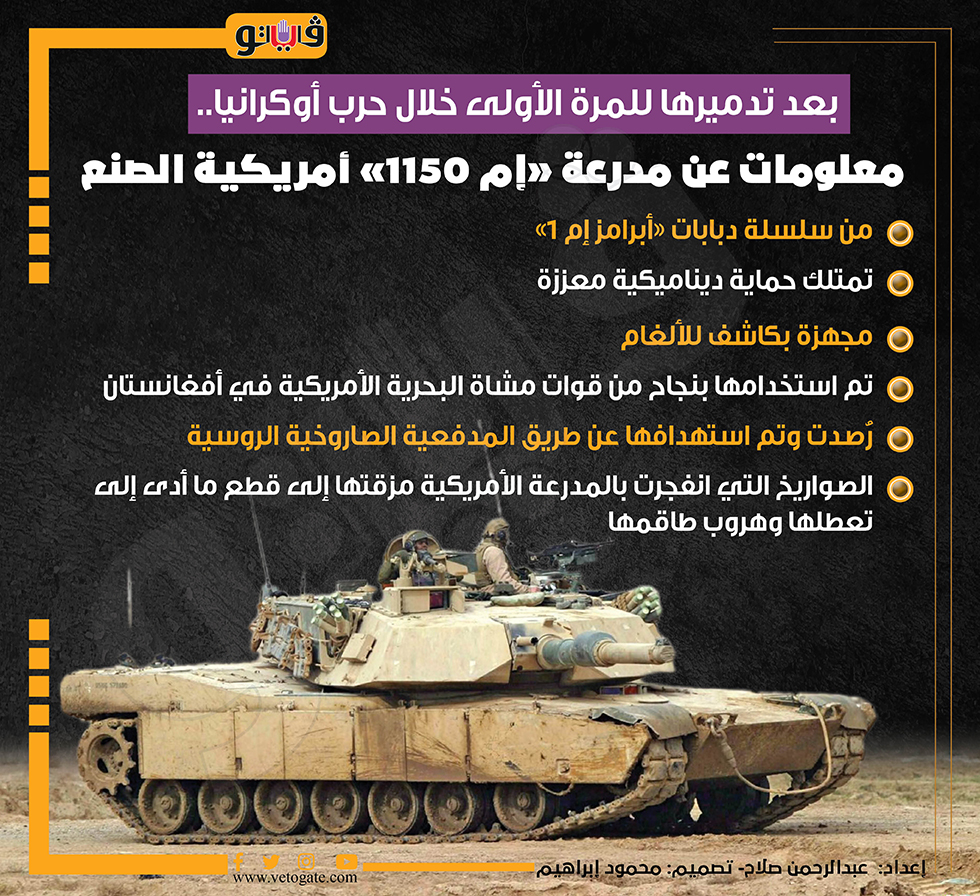 بعد تدميرها للمرة الأولى خلال حرب أوكرانيا.. معلومات عن مدرعة "إم 1150" أمريكية الصنع (إنفوجراف) السبت 24/فبراير/2024 - 04:22 م 2/24/2024 4:22:33 PM إم 1150، فيتو عبدالرحمن صلاح شارك طباعة 18 حجم الخط شارك طباعة مدرعة إم 1150 الولايات المتحدة إبرامز روسيا أوكرانيا حرب روسيا وأوكرانيا