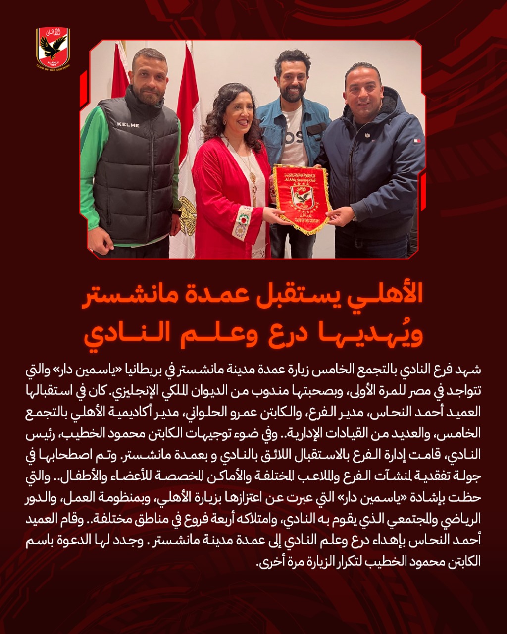 الأهلي يستقبل عمدة مانشستر ويهديها درع وعلم النادي