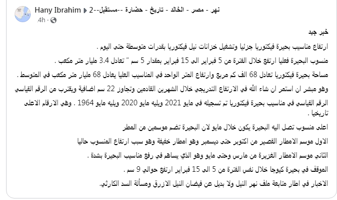 ارتفاع منسوب المياه في بحيرة فيكتوريا، كشفه هاني إبراهيم قائلًا: "خبر جيد.. ارتفاع مناسيب بحيرة فيكتوريا جزئيا وتشغيل خزانات نيل فيكتوريا بقدرات متوسطة حتى اليوم. منسوب البحيرة فعليا ارتفع خلال الفترة من 5 فبراير الى 15 فبراير بمقدار 5 سم " تعادل 3.4 مليار متر مكعب."