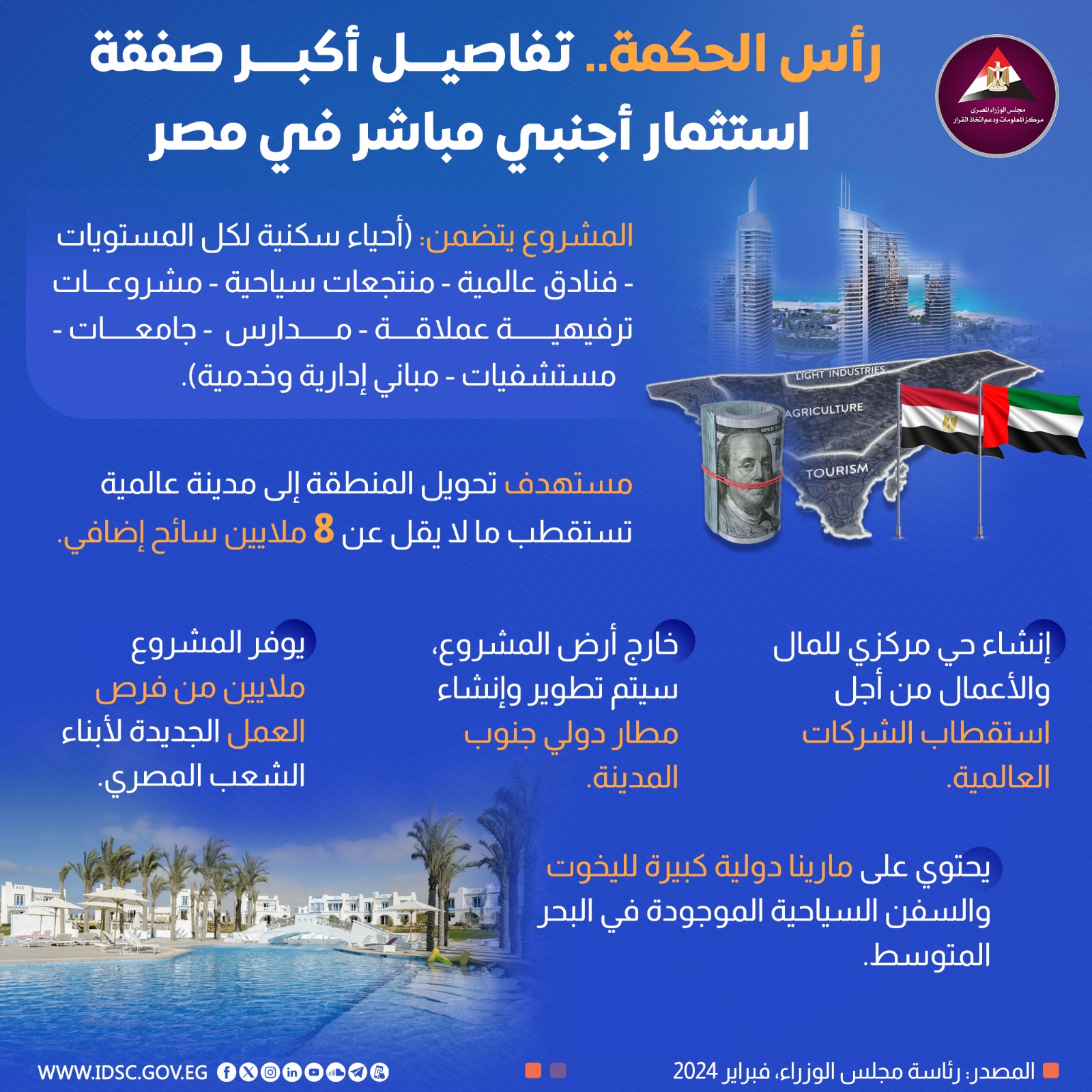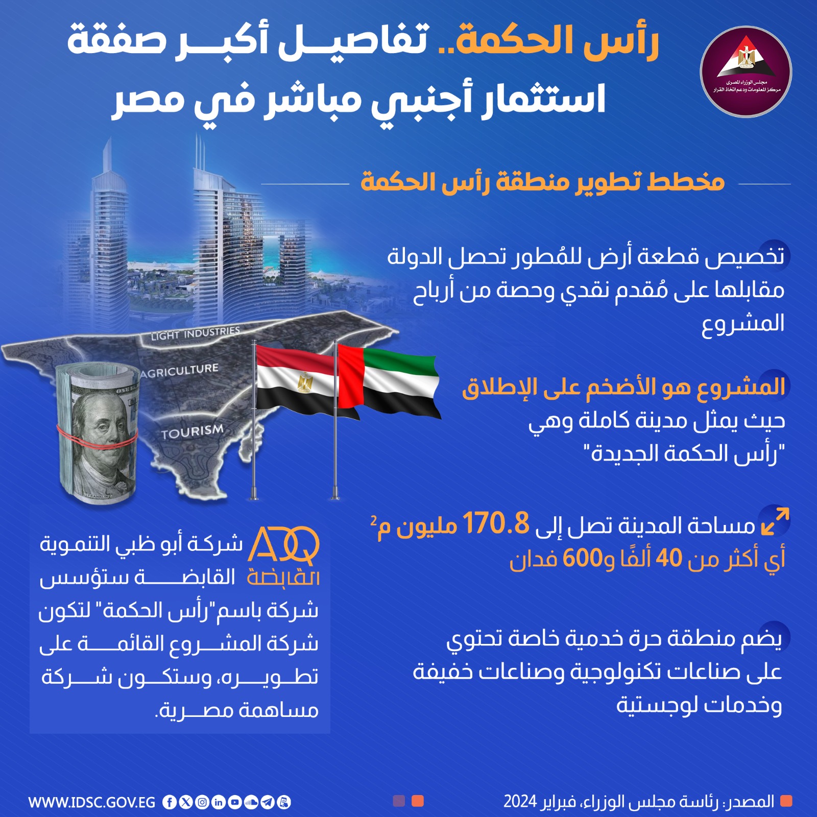 نشرت الصفحة الرسمية لمركز المعلومات ودعم اتخاذ القرار بمجلس الوزراء على موقع التواصل الاجتماعي "فيسبوك" إنفوجرافا جديدا تحت عنوان (رأس الحكمة..تفاصيل أكبر صفقة استثمار أجنبي مباشر في مصر)