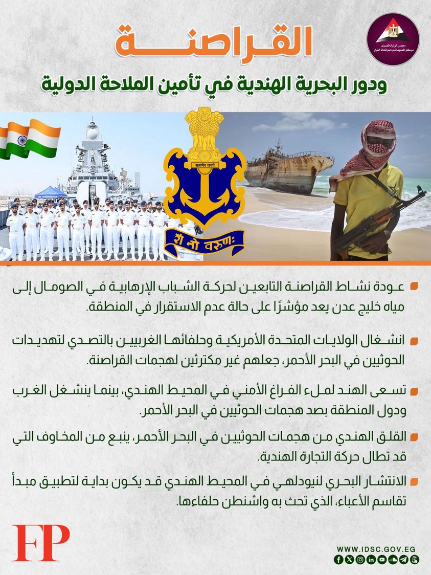 نشرت الصفحة الرسمية لمركز المعلومات ودعم اتخاذ القرار بمجلس الوزراء على موقع التواصل الاجتماعي "فيسبوك" إنفوجرافا جديدا تحت عنوان (القراصنة ودور البحرية الهندية في تأمين الملاحة الدولية)