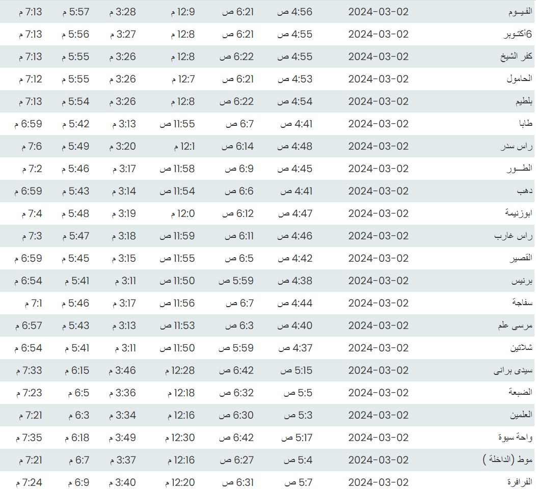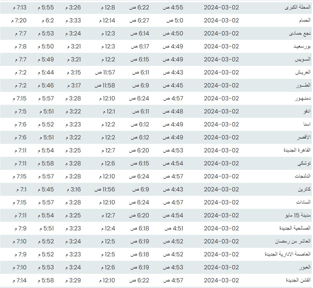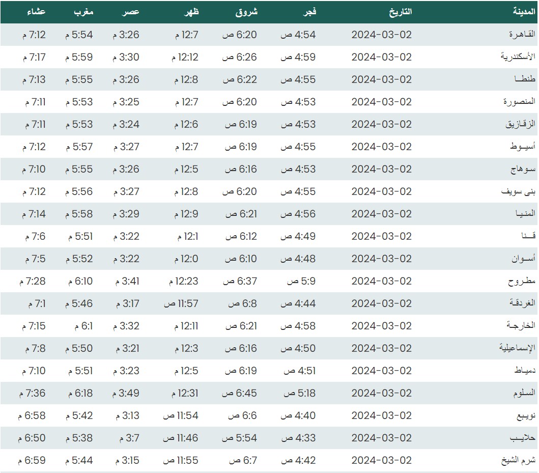 وفيما يلي مواقيت الصلاة، لعدد من مدن ومحافظات الجمهورية من واقع بيانات الهيئة العامة للمساحة