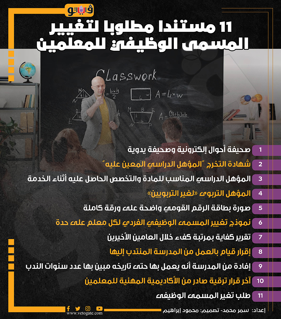 11 مستندا مطلوبا لتغيير المسمى الوظيفي للمعلمين (إنفوجراف) الثلاثاء 27/فبراير/2024 - 07:30 م 2/27/2024 7:30:55 PM وزارة التربية والتعليم، فيتو سمر محمد شارك طباعة 18 حجم الخط شارك طباعة المسمى الوظيفى للمعلمين تغيير المسمى الوظيفى للمعلمين صحيفة أحوال الكترونية التربية والتعليم وزارة التربية والتعليم
