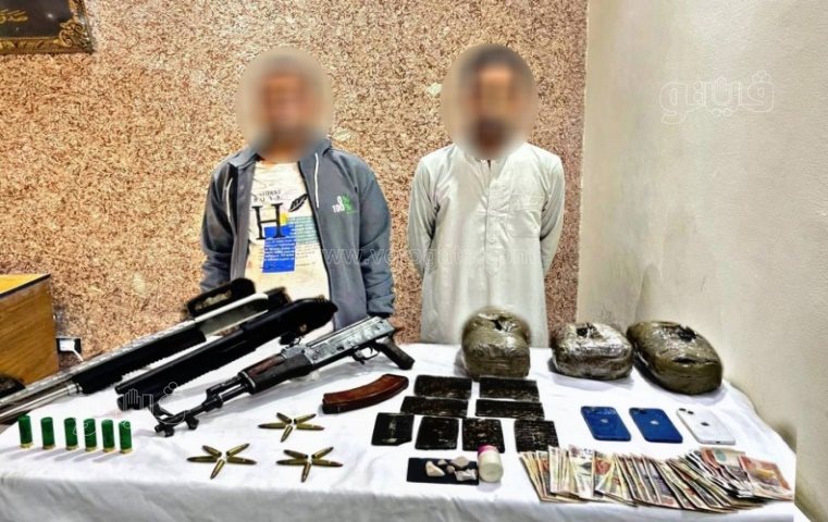 فى مديرية أمن أسوان؛ ضبط (عنصرين إجراميين "لهما معلومات جنائية")، وبحوزتهما (15 كيلو جرام لمخدر البانجو - 2 كيلو جرام لمخدر الحشيش- كمية لمخدر الهيروين - بندقية آلية - 2 بندقية خرطوش- عدد من الطلقات النارية - 2 سيارة ربع نقل).