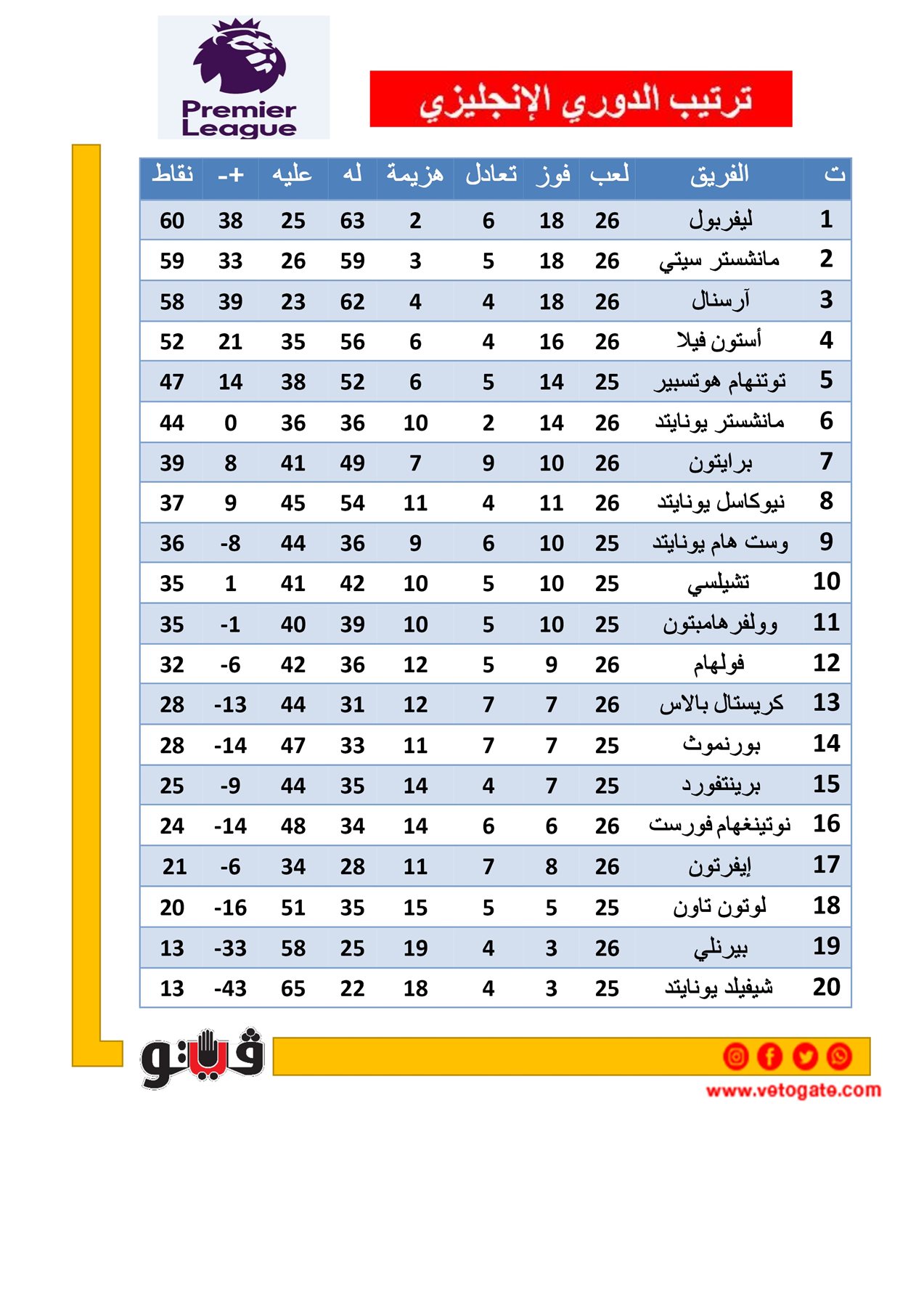 يواصل ليفربول صدارة جدول ترتيب الدوري الإنجليزي الممتاز برصيد 60 نقطة ويليه مانشستر سيتي وأرسنال.