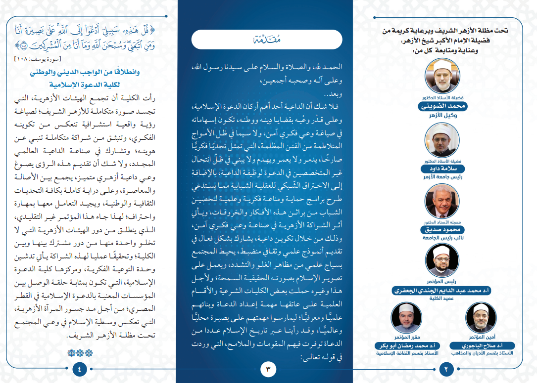 وتنظم الكلية المؤتمر برئاسة الدكتور محمد عبد الدايم الجندي الجعفري عميد كلية الدعوة الإسلامية بالقاهرة، ويتولى مقرر المؤتمر الدكتور محمد رمضان وكيل الكلية لشئون التعليم والطلاب، وأمين عام المؤتمر الدكتور صلاح الباجوري وكيل الكلية لشئون الدراسات العليا والبحوث