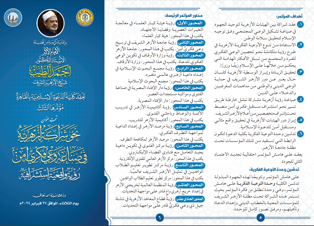 وتنظم كلية الدعوة الإسلامية بجامعة الأزهر هذا المؤتمر، انطلاقًا من إيمانها الراسخ بضرورة مناقشة التحديات الفكرية والثقافية التي تواجه العالم الإسلامي، والسعي إلى توحيد الجهود الدعوية لبلورة حلول فعالة، لتعزز وعي فكري سليم يحصن المجتمعات من الأفكار المتطرفة ويواجه الغزو الثقافي بعلم راسخ وفهم مستنير.