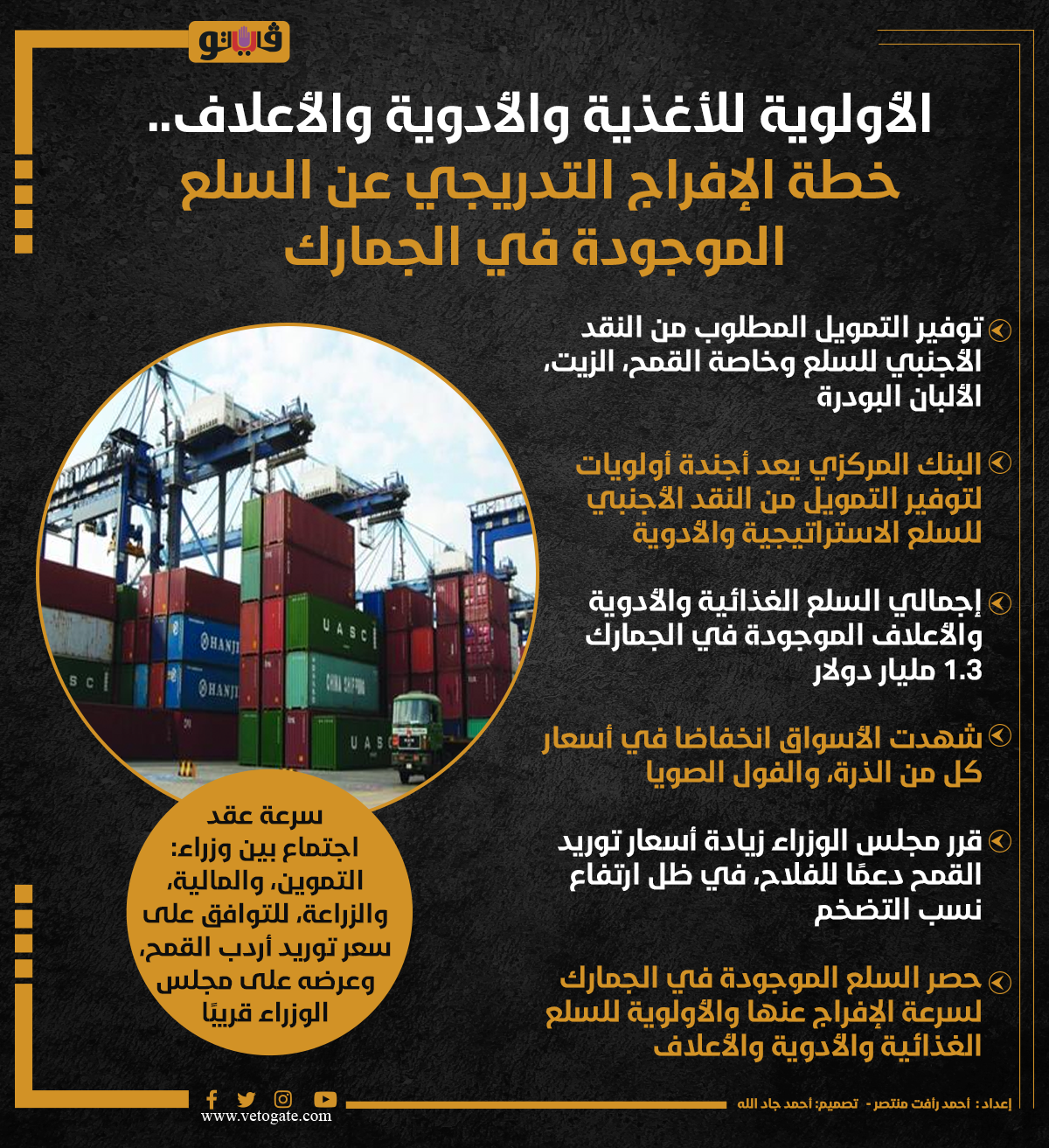 الأولوية للأغذية والأدوية والأعلاف.. خطة الإفراج التدريجي عن السلع الموجودة في الجمارك (إنفوجراف) الأحد 25/فبراير/2024 - 08:11 م 2/25/2024 8:11:23 PM خطة الإفراج التدريجي عن السلع، فيتو أحمد رأفت منتصر شارك طباعة 18 حجم الخط شارك طباعة خطة الإفراج التدريجي عن السلع المودودة في الجمارك الاعلاف مجلس الوزراء قرارات مجلس الوزراء