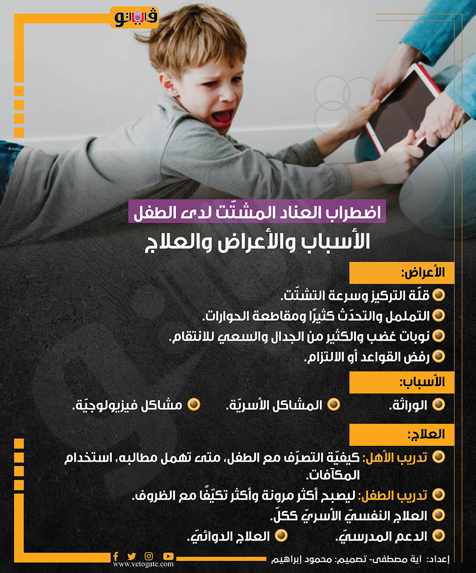 اضطراب العناد المشتّت لدى الطفل، الأسباب والأعراض والعلاج (إنفوجراف) السبت 09/مارس/2024 - 01:02 م 3/9/2024 1:02:30 PM عناد الأطفال، فيتو آية مصطفى شارك طباعة 18 حجم الخط شارك طباعة انفوجراف العلاج الدوائي العلاج النفسى اضطراب العناد المشت ت قل ة التركيز
