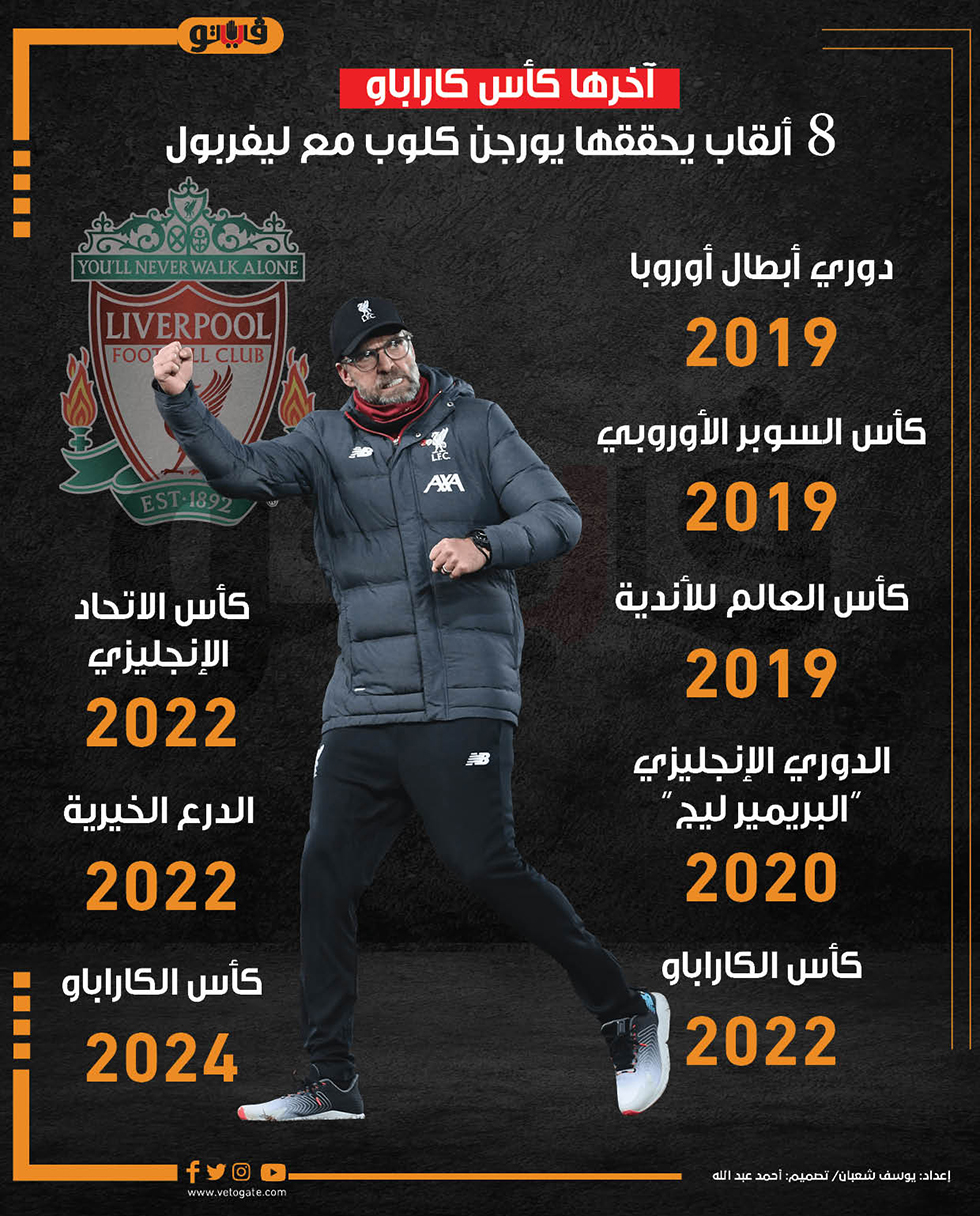 آخرها كأس كاراباو.. 8 ألقاب يحققها يورجن كلوب مع ليفربول (إنفوجراف) الإثنين 26/فبراير/2024 - 12:31 م 2/26/2024 12:31:24 PM يورجن كلوب، المدير الفني لفريق ليفربول، فيتو يوسف شعبان شارك طباعة 18 حجم الخط شارك طباعة ليفربول كأس رابطة المحترفين الإنجليزية تشيلسي ملعب ويمبلي يورجن كلوب دوري ابطال اوروبا كاس السوبر الاوروبي كأس العالم للأندية الدوري الانجليزي