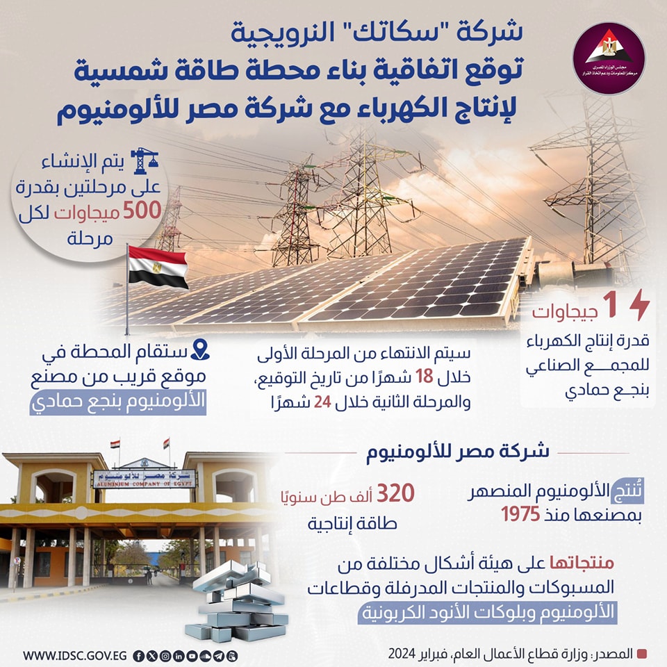 نشرت الصفحة الرسمية لمركز المعلومات ودعم اتخاذ القرار بمجلس الوزراء على موقع التواصل الاجتماعي "فيسبوك" إنفوجرافا جديدا تحت عنوان (شركة "سكاتك "النروجية توقع اتفاقية بناء محطة الطاقة الشمسية لإنتاج الكهرباء مع شركة مصر للألومنيوم)