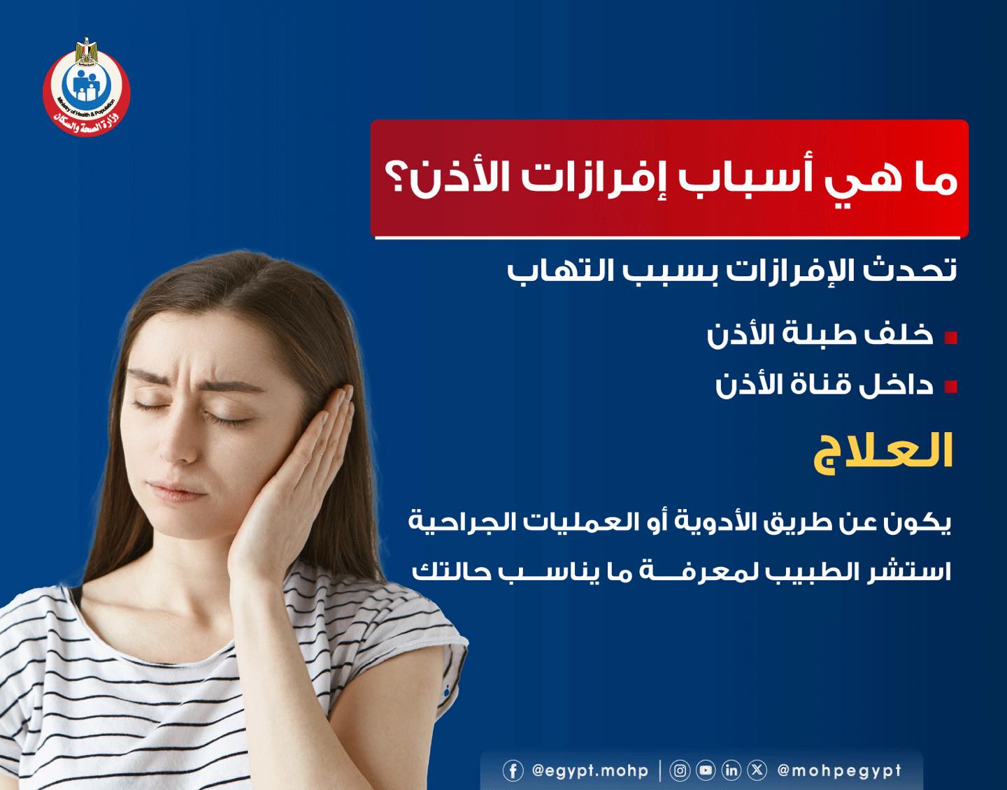 وقالت وزارة الصحة إن أهم أسباب إفرازات الأذن تحدث بسبب التهاب خلف طبلة الأذن وداخل قناة الأذن.