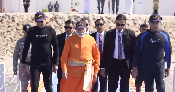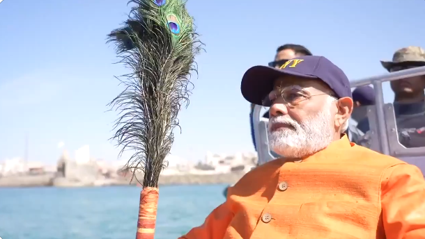 كما ظهر رئيس وزراء الهند في مقطع الفيديو، وهو يرتدي معدات الغوص، ونزل إلى البحر لأداء الصلاة الهندوسية، وعندما وصل لقاع البحر قام بغرس العصا التي تحمل ريش الطاووس، في الموقع، الذي يعتبره الهندوس، من المواقع ذو الأهمية التاريخية والروحية للهندوس.