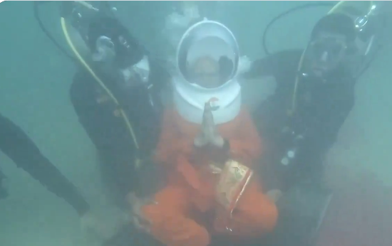 رئيس وزراء الهند، تداول نشطاء مواقع التواصل الاجتماعي مقطع فيديو مثير وغريب، لرئيس وزراء الهند ناريندرا مودي، وظهر في الفيديو وهو يغطس في مياه البحر، ممسكًا بيده بعض ريشات الطاووس، وقام بغرسها في القاع، ثم قام بعمل حركات الصلاة الهندوسية، وجلس القرفصاء لبضع دقائق، حتى انتهي من صلاته المائية، ثم خرج بعد ذلك من الماء.