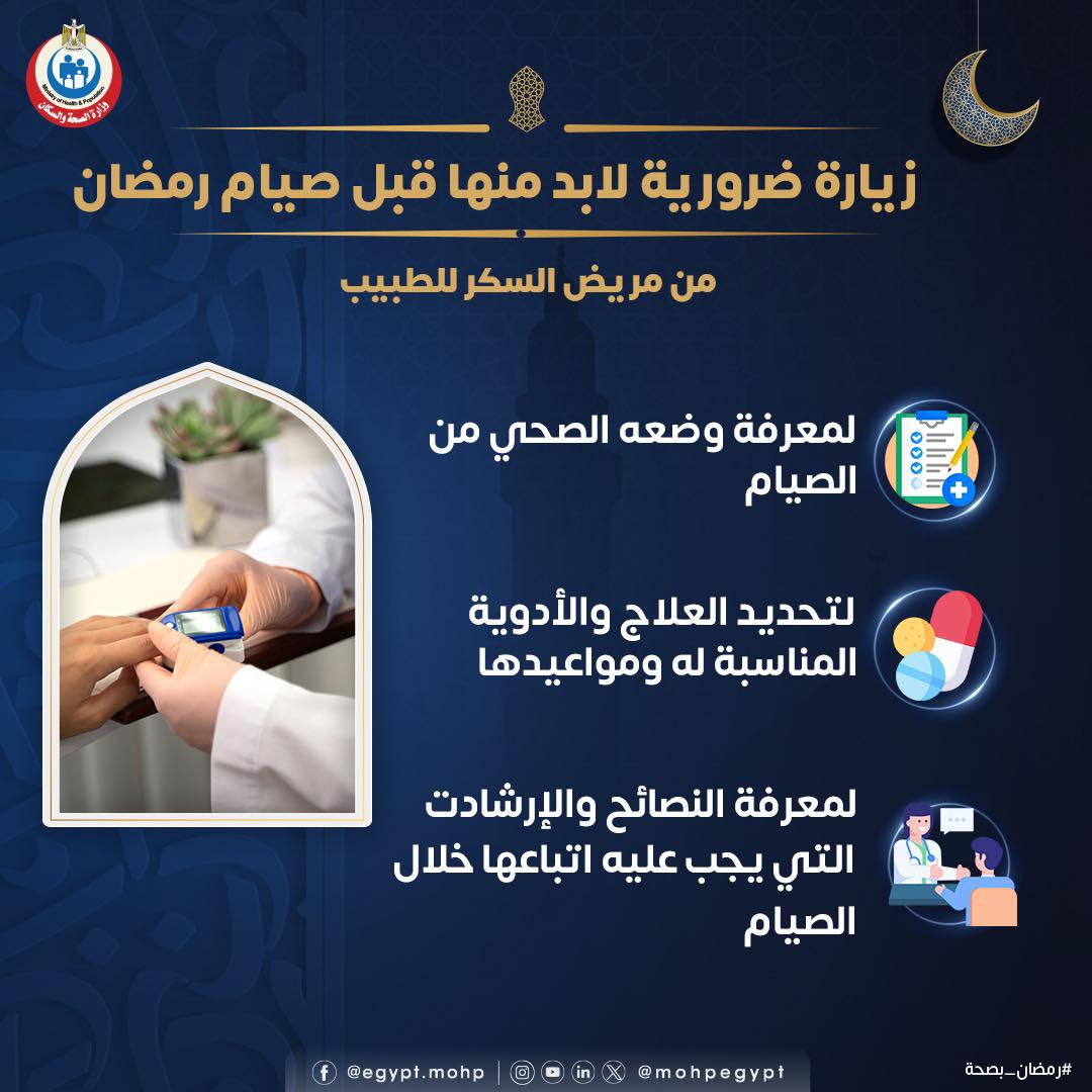 وجهت وزارة الصحة نصائح مهمة لمرضى السكر قبل صيام شهر رمضان بضرورة زيارة الطبيب المختص قبل شهر رمضان للاطمئنان على حالته الصحية ومعرفة أهم النصائح والإرشادات للصيام.