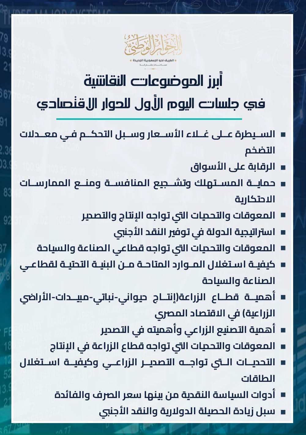 عقد مجلس أمناء الحوار الوطني، جلسات الحوار الاقتصادي بمشاركة الحكومة والخبراء والمتخصصين بشأن بحث القضايا الاقتصادية العاجلة وإيجاد حلول سريعة وقابلة للتنفيذ.