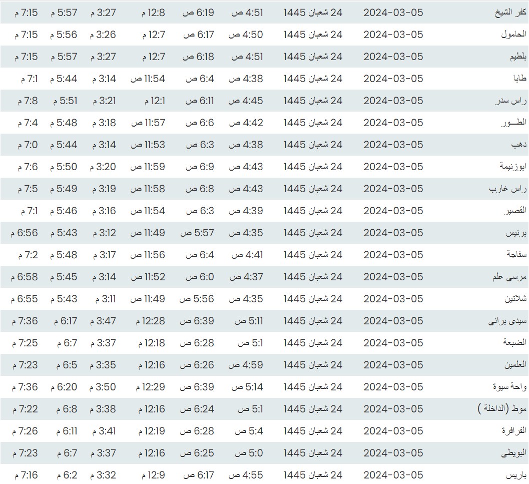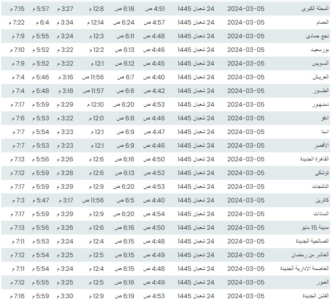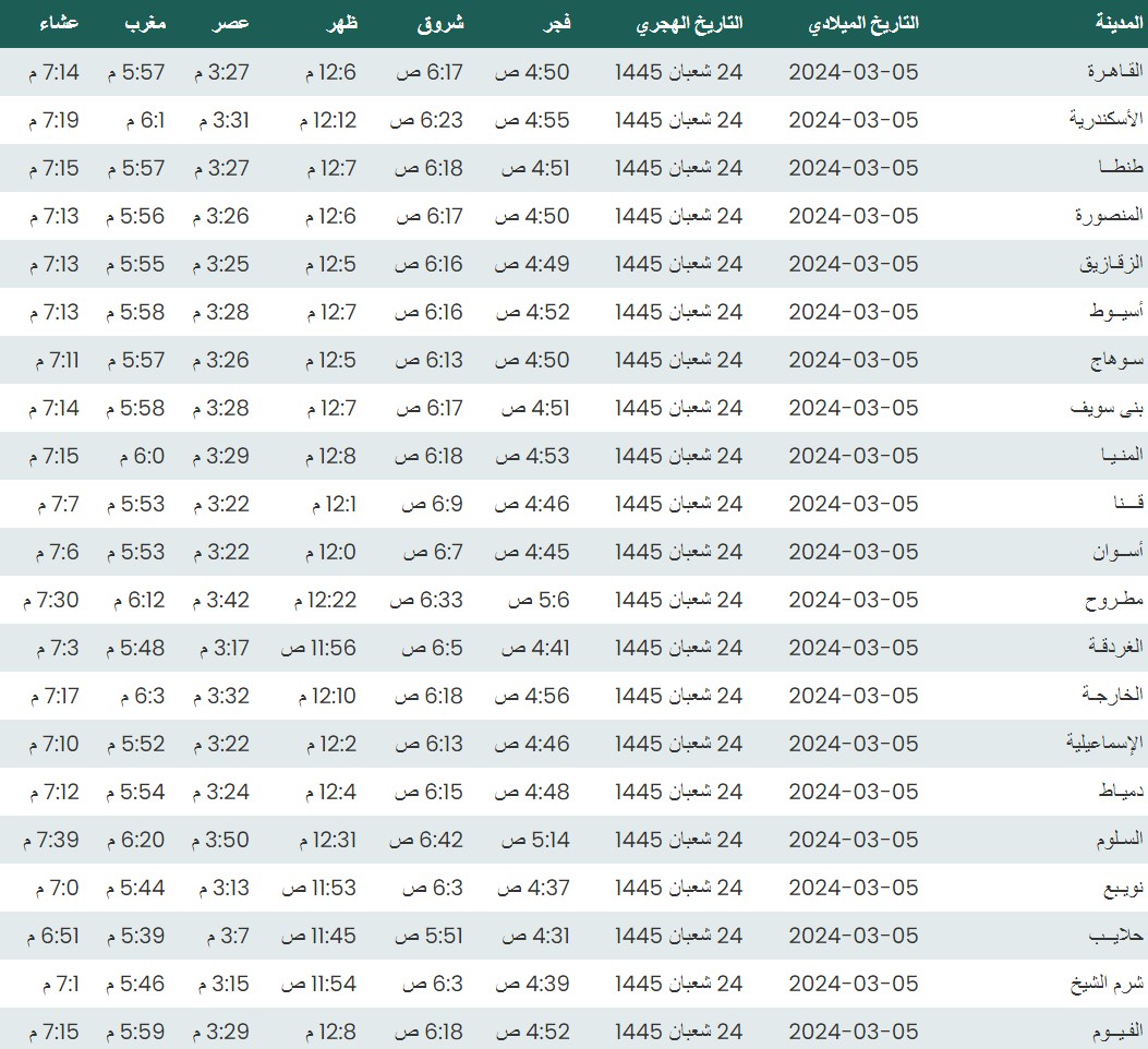 وفيما يلي مواقيت الصلاة، لعدد من مدن ومحافظات الجمهورية من واقع بيانات الهيئة العامة للمساحة
