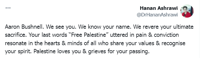 علقت حنان عشراوي، السياسية الفلسطينية السابقة ومفاوضة السلام، قائلة: "آرون بوشنل. نحن نراك. نحن نعرف اسمك. نحن نقدر تضحياتك النهائية. كلماتك الأخيرة "فلسطين حرة" التي نطقتها بألم وقناعة يتردد صداها في قلوب وعقول جميع الذين يشاركونك قيمك ويقدرون روحك. فلسطين تحبك وتحزن على فراقك."