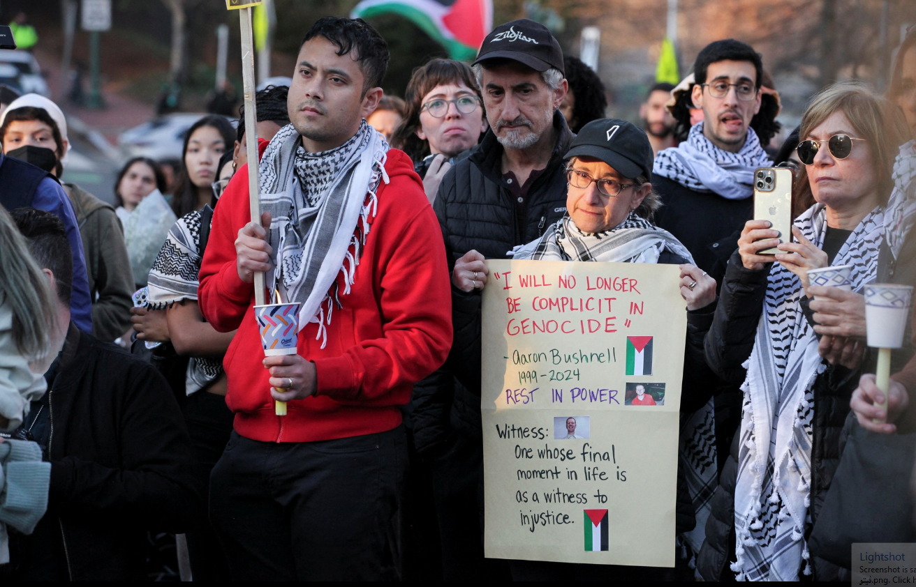 وقال الناشط الحقوقي أحمد محمد الدويني: " إقبال كبير على شراء العلم الفلسطيني في أمريكا… بعد انتحار… آرون بوشنيل.. AARON BUSHNELL"