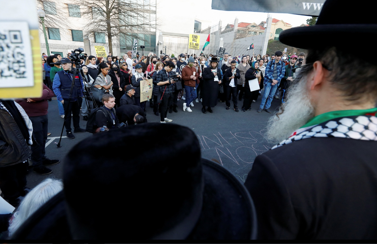 وعلق جمال الطالب قائلًا: "في نفس المكان الذي أحرق فيه الضابط الأميركي #آرون_بوشنل نفسه.. متظاهرون ينظمون وقفة احتجاجية أمام السفارة الإسرائيلية في #واشنطن رفضا للحرب على #غزة"