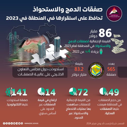 86 مليار دولار.. صفقات الدمج والاستحواذ تحافظ على استقرارها بالمنطقة خلال 2023 (إنفوجراف)