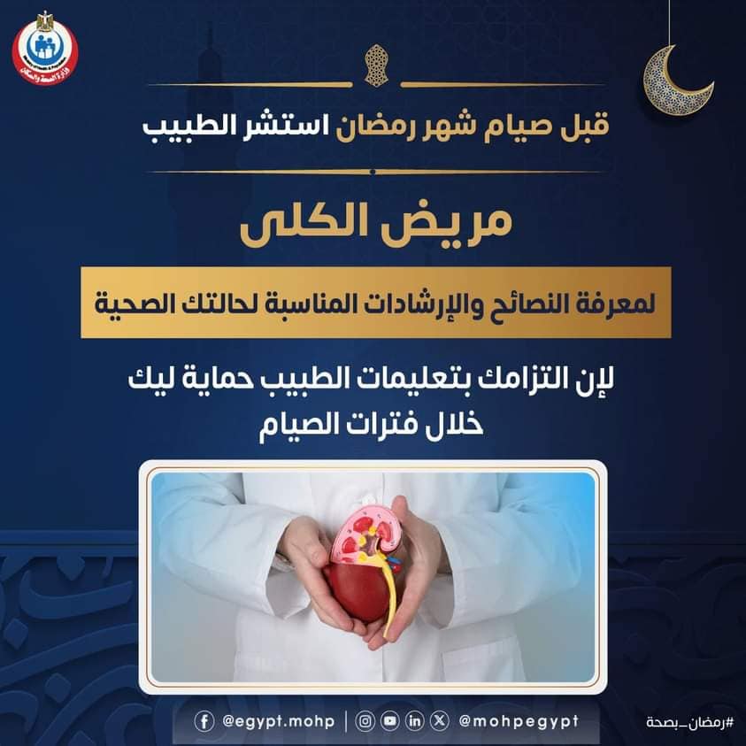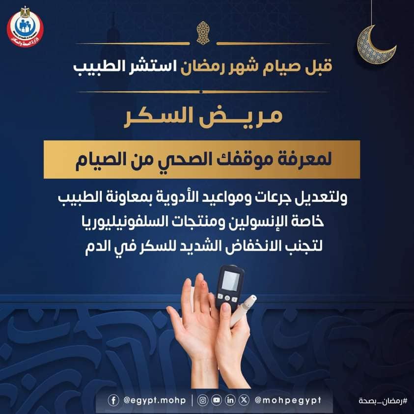وتأتى اهمية زيارة الطبيب قبل بدء شهر رمضان لتحديد قدرة المريض على الصيام وإجراء تعديلات في جرعات ومواعيد الدواء لتلائم السحور والإفطار أو الاعتماد على أدوية ذات المفعول الطويل