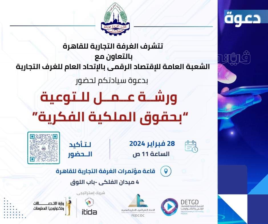 غرفة القاهرة تنظم ورشة عمل التوعية بحقوق الملكية الفكرية، تنظم الغرفة التجارية لمحافظة القاهرة بالتعاون مع الشعبة العامة للاقتصاد الرقمي وتكنولوجيا المعلومات بالاتحاد العام للغرف التجارية، ورشة عمل للتوعية بحقوق الملكية الفكرية، وذلك اليوم الأربعاء الموافق 28 فبراير الجاري، بمقر الغرفة التجارية بالقاهرة باب اللوق.