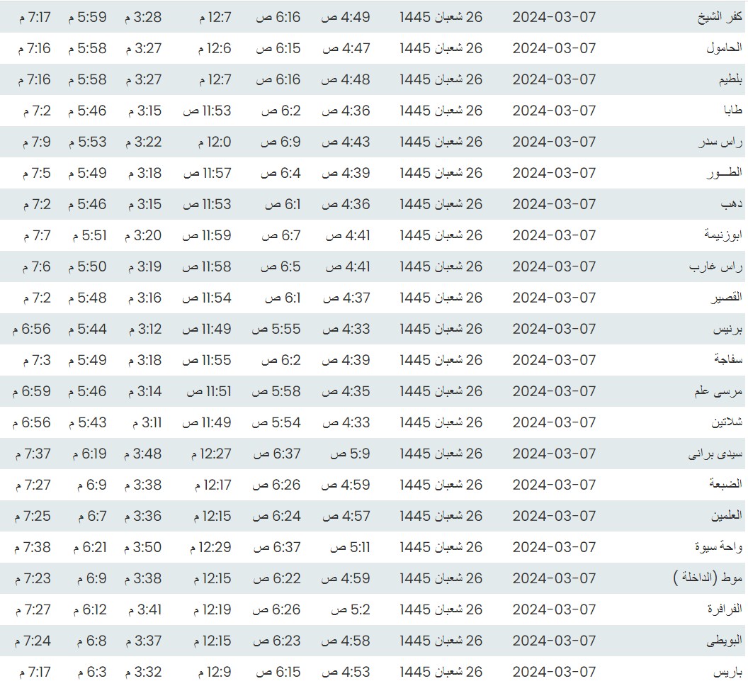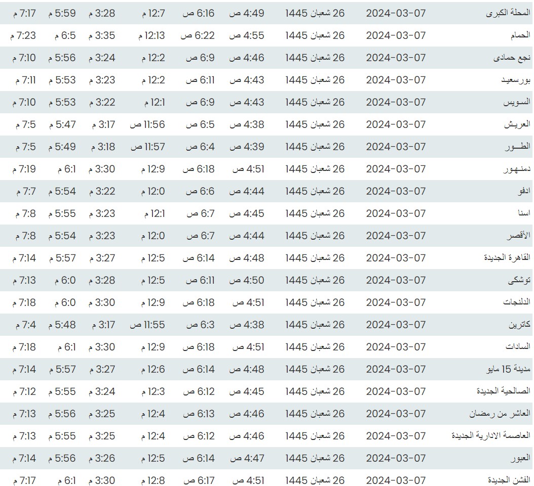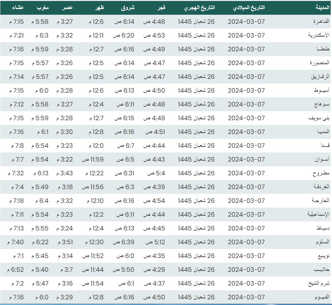 وفيما يلي مواقيت الصلاة، لعدد من مدن ومحافظات الجمهورية من واقع بيانات الهيئة العامة للمساحة