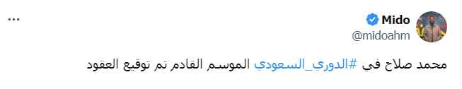 وقال بومشاري: " محمد صلاح في الدوري السعودي أعلن الدولي المصري السابق والإعلامي أحمد حسام ميدو عبر تغريدة على حسابه الموثق في "أكس" أن لاعب المنتخب المصري ونادي ليفربول الإنجليزي محمد صلاح انتقل إلى أحد فرق الدوري السعودي لكرة القدم مؤكدًا أن الصفقة تمت بالفعل وأنه وقع العقد"