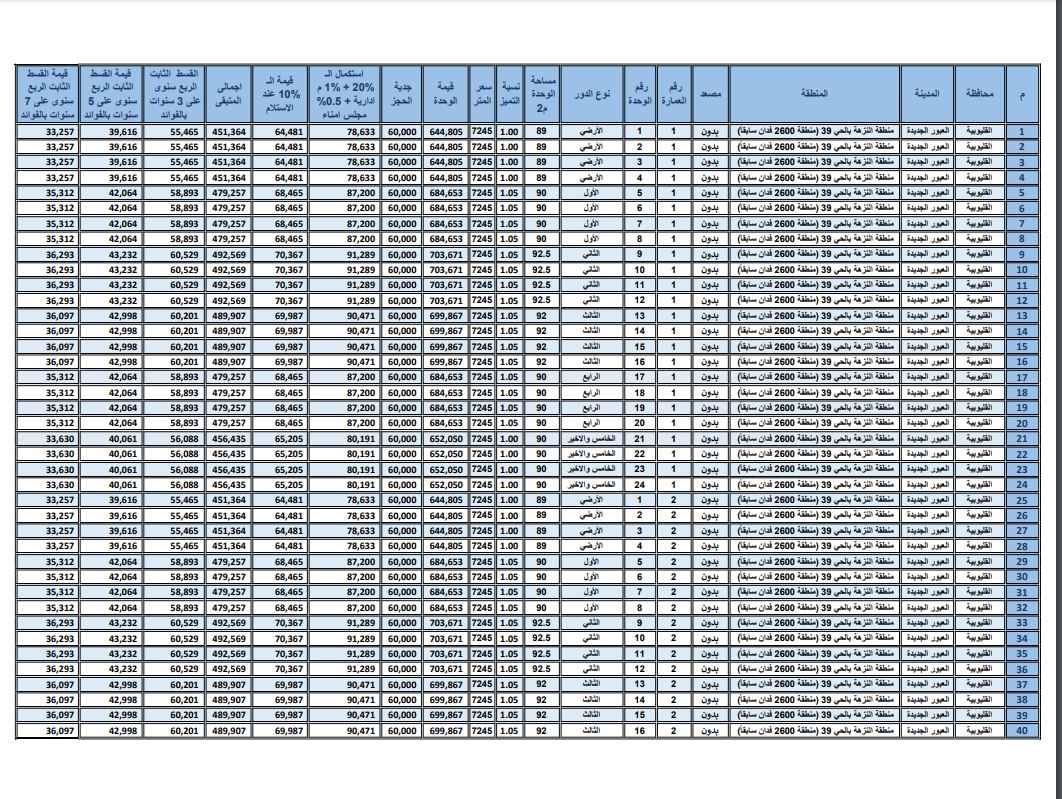 وسجل سعر المتر 7245 جنيها وقائمة الاسعار كالتالي:
