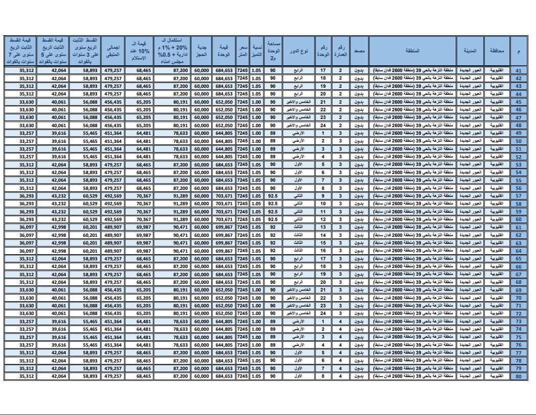 وتطرح الوزارة ٨٣٩ وحدة سكنية بمساحات تتراوح بين ٥٧م٢ و٩٣م٢، بمدينتي العبور وأسيوط الجديدتين، للذين لم يحالفهم الحظ، وذلك بنظام القرعة العلنية اليدوية من خلال بنك التعمير والإسكان على عكس الطرح الأصلي الذي كان عن بأسبقية الحجز إلكترونيًّا.