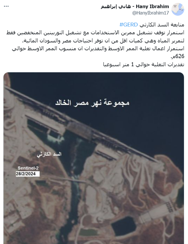 وقال الباحث في حوض النيل هاني إبراهيم: "متابعة السد الكارثي.. سد النهضة، استمرار توقف تشغيل ممرين الاستخدامات مع تشغيل التوربينين المنخفضين فقط لتمرير المياه وهي كميات أقل من أن توفر احتياجات مصر والسودان المائية.. استمرار اعمال تعلية الممر الأوسط والتقديرات أن منسوب الممر الأوسط حوالي 626 م. تقديرات التعلية حوالي 1 متر أسبوعيًا".