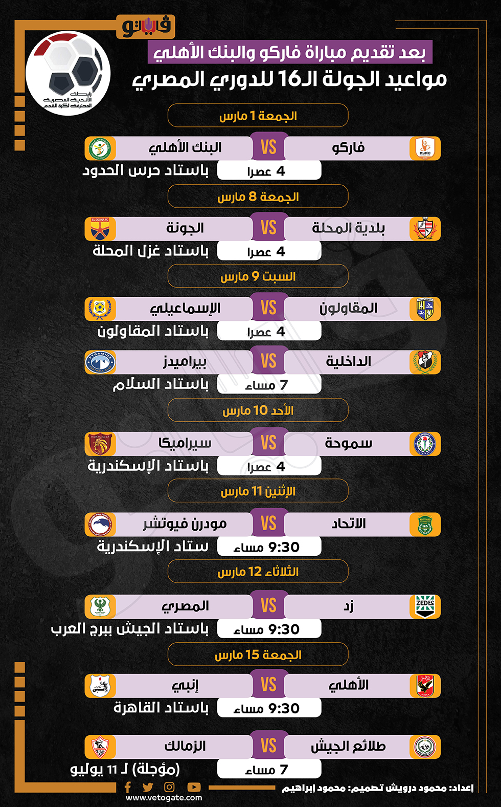 بعد تقديم مباراة فاركو والبنك الأهلي، مواعيد الجولة الـ16 للدوري المصري (انفوجراف) السبت 02/مارس/2024 - 02:50 م 3/2/2024 2:50:47 PM مواعيد الجولة الـ16 للدوري المصري، فيتو محمود درويش شارك طباعة 18 حجم الخط شارك طباعة الدورى المصرى الممتاز الدوري المصري مواعيد مباريات الدوري المصري الممتاز فاركو ضد البنك الأهلي بلدية المحلة الجونة المقاولون ضد الاسماعيلي