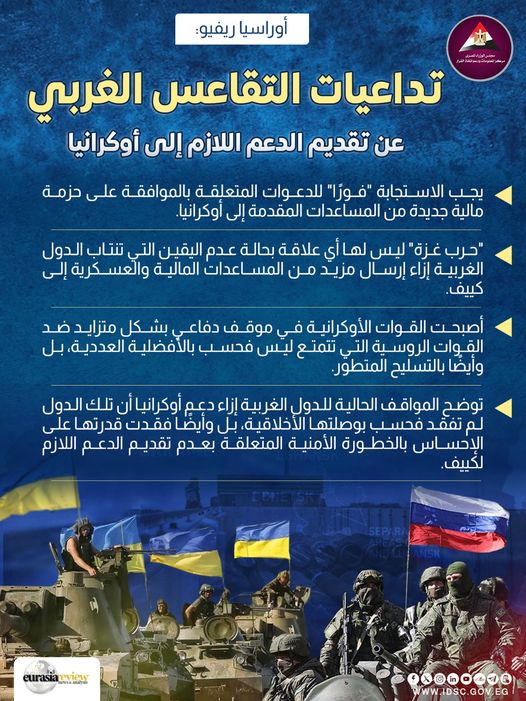 نشرت الصفحة الرسمية لمركز المعلومات ودعم اتخاذ القرار بمجلس الوزراء على موقع التواصل الاجتماعي "فيسبوك" إنفوجراف جديدا تحت عنوان (تداعيات التقاعس الغربي عن تقديم الدعم اللازم إلى أوكرانيا).