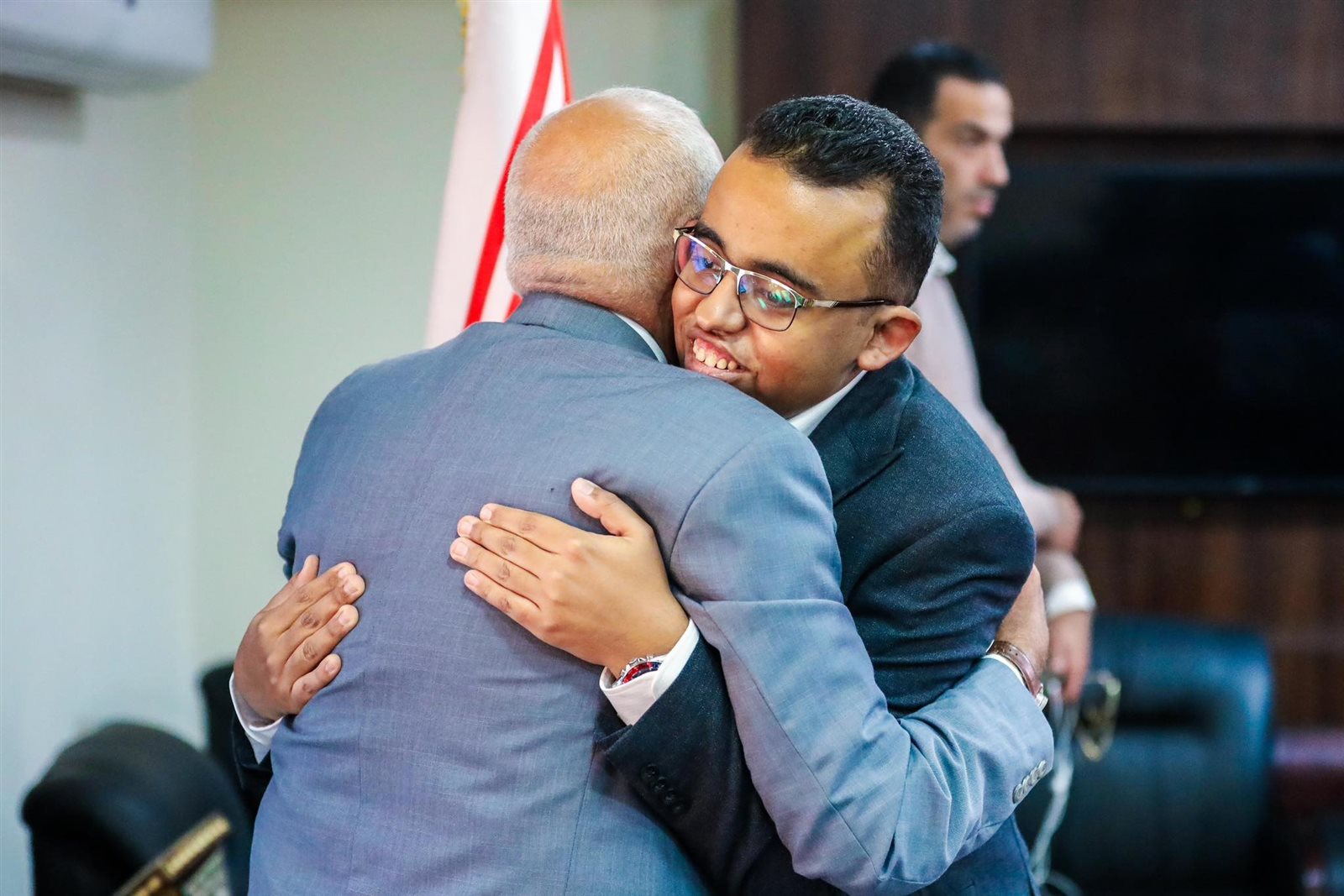 صعد الرئيس عبد الفتاح السيسي، إلى مسرح احتفالية "قادرون باختلاف"، ليصافح ويقبل رأس الطفل الفلسطيني عبدالله الكحيل، ضحية الاحتلال الإسرائيلي على قطاع غزة، والذي تلقى العلاج بمستشفى معهد ناصر، تنفيذا لتوجيهات الرئيس السيسي.